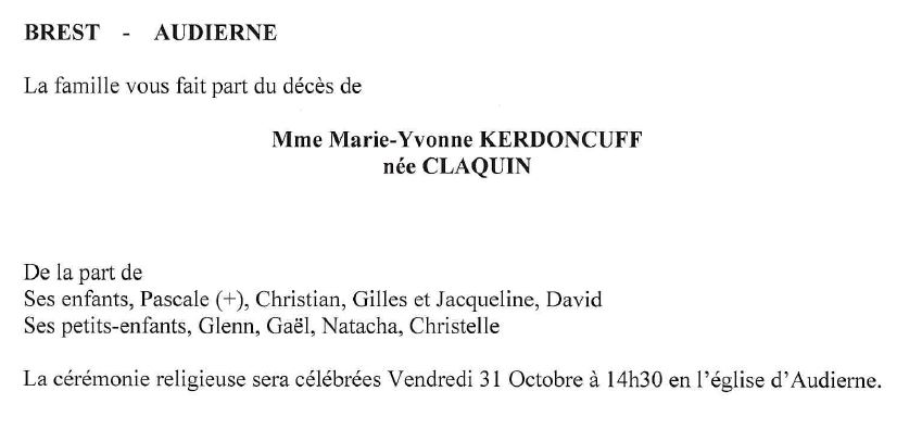 de Madame Marie-Yvonne KERDONCUFF née CLAQUIN