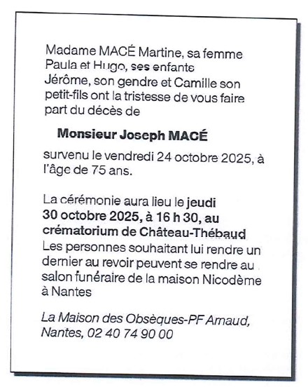 Cet espace « condoléances » est dédié à la mémoire de Monsieur Joseph MACÉ.