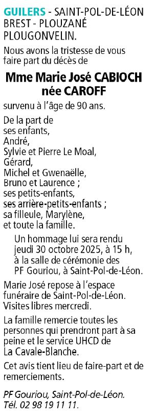 Cet espace « condoléances » est dédié à la mémoire de Madame Marie José CABIOCH née CAROFF.