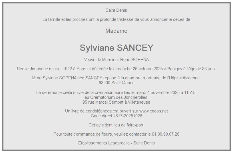 Cet espace « condoléances » est dédié à la mémoire de Madame Sylviane SOPENA née SANCEY.