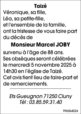 Cet espace « condoléances » est dédié à la mémoire de Monsieur Marcel JOBY.