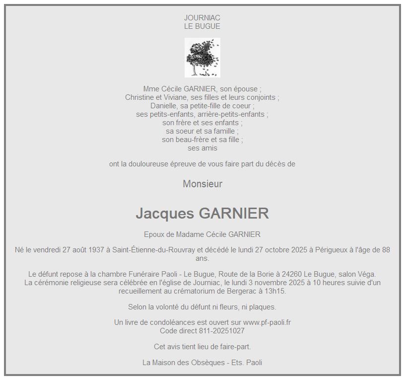 Cet espace « condoléances » est dédié à la mémoire de Monsieur Jacques GARNIER.