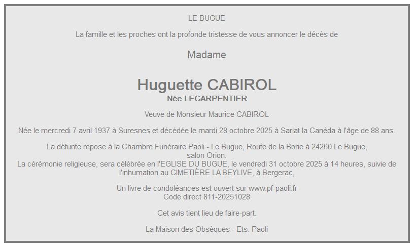 Cet espace « condoléances » est dédié à la mémoire de Madame Huguette CABIROL née LECARPENTIER.