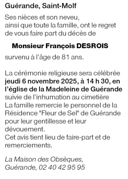 Cet espace « condoléances » est dédié à la mémoire de Monsieur François DESROIS.