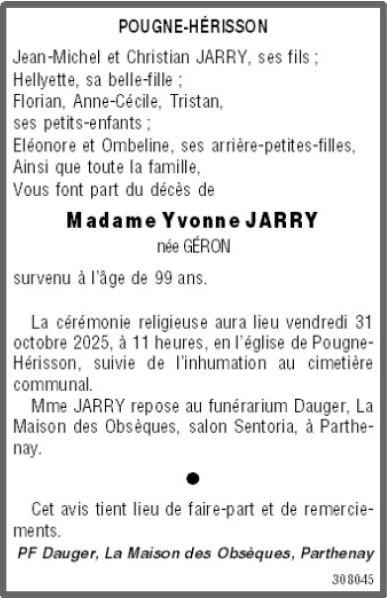 Cet espace « condoléances » est dédié à la mémoire de Madame Yvonne JARRY née GÉRON.