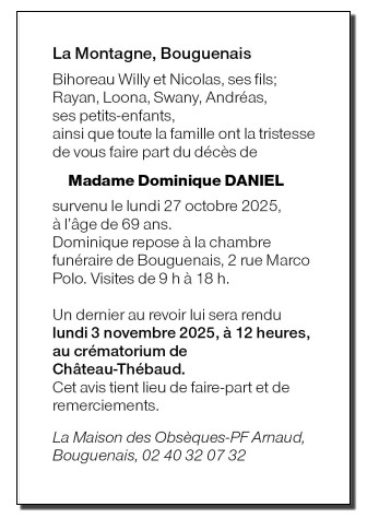 Cet espace « condoléances » est dédié à la mémoire de Madame Dominique DANIEL.
