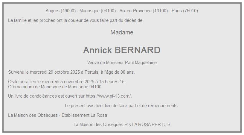 Cet espace « condoléances » est dédié à la mémoire de Madame Annick Magdelaine née BERNARD.