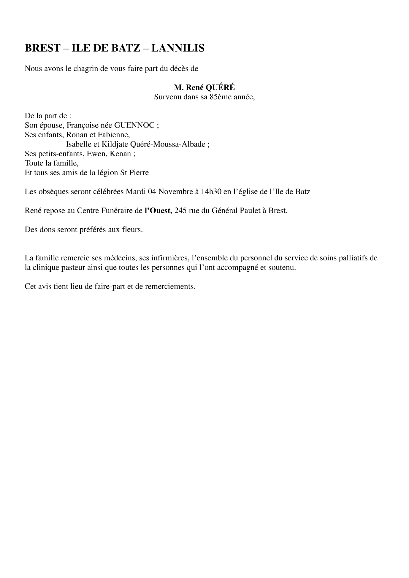 Cet espace « condoléances » est dédié à la mémoire de Monsieur René QUÉRÉ.