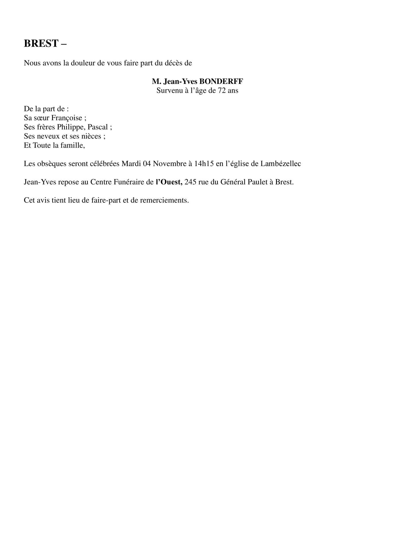 Cet espace « condoléances » est dédié à la mémoire de Monsieur Jean-Yves BONDERFF.