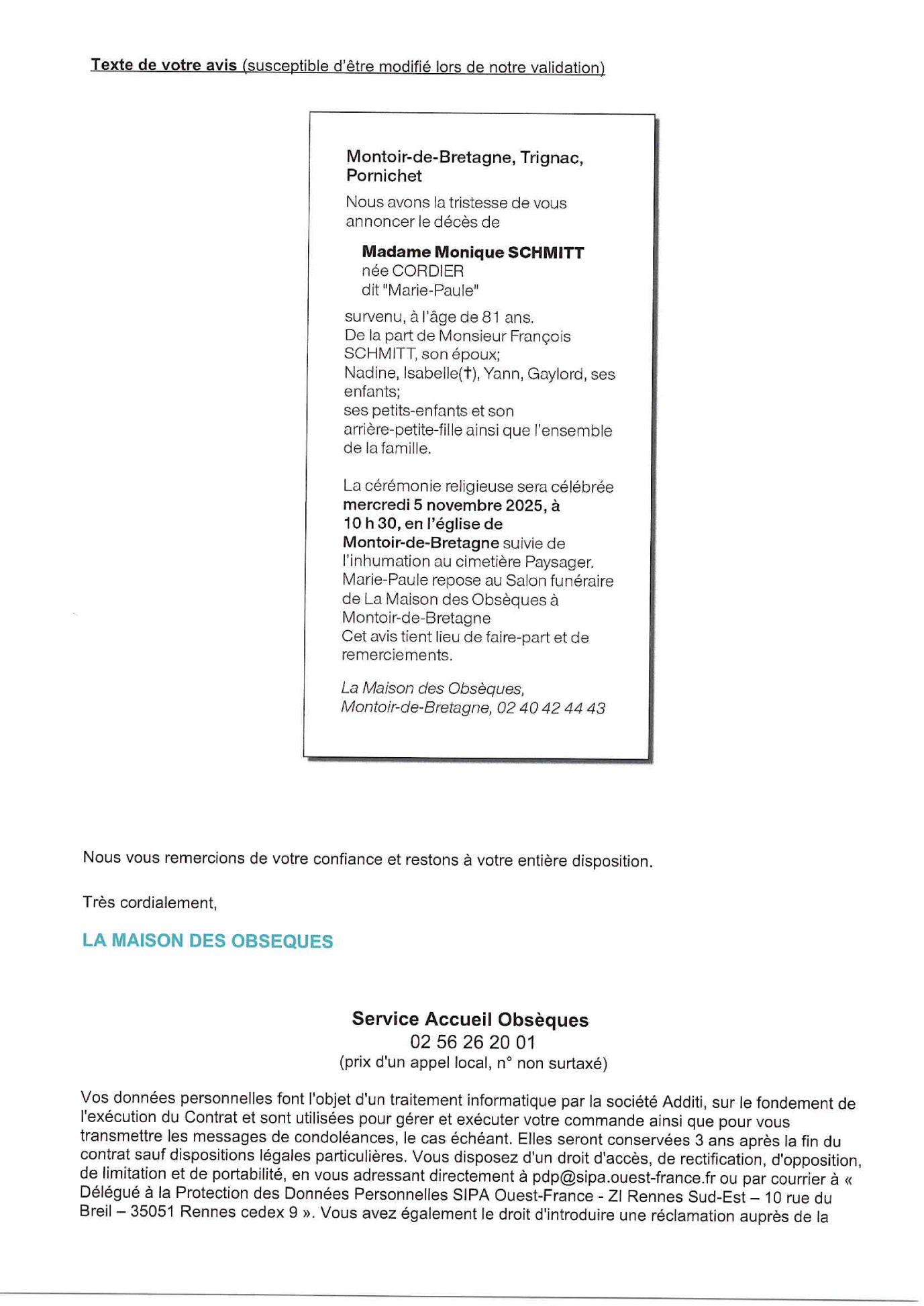 Cet espace « condoléances » est dédié à la mémoire de Madame Monique SCHMITT née CORDIER.