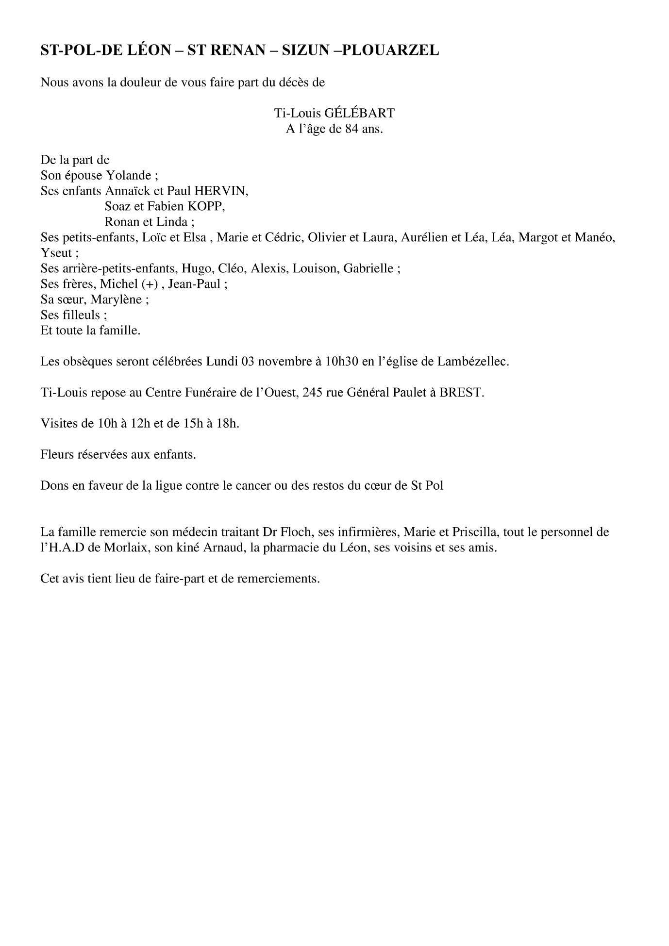 Cet espace « condoléances » est dédié à la mémoire de Monsieur Louis GÉLÉBART.