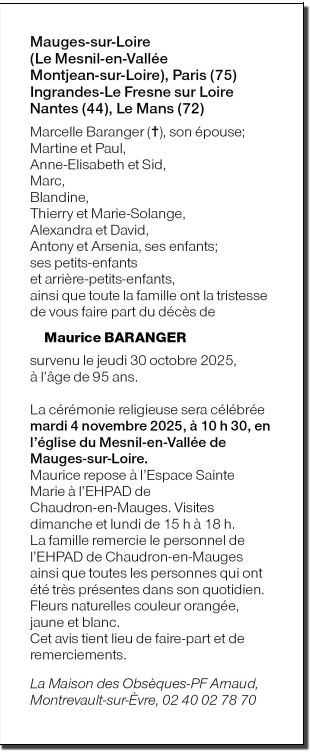 Cet espace « condoléances » est dédié à la mémoire de Monsieur Maurice BARANGER.