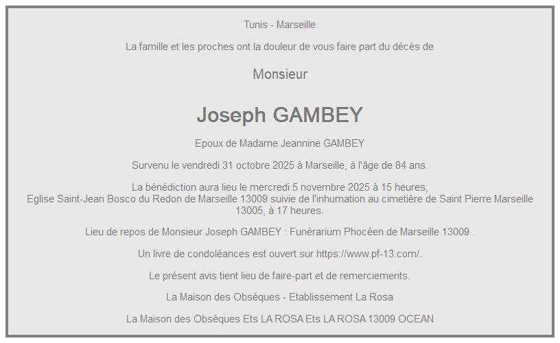 Cet espace « condoléances » est dédié à la mémoire de Monsieur Joseph GAMBEY.