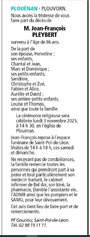Décédé à Plouenan (29420) le jeudi 30 octobre 2025
