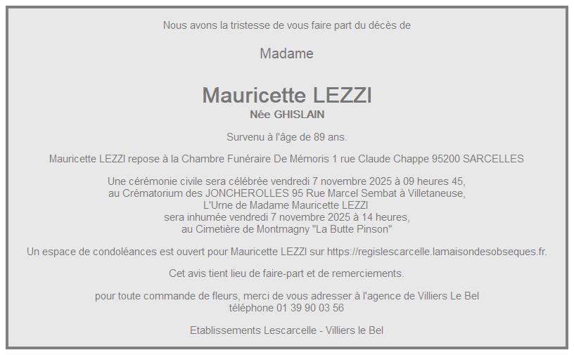 Cet espace « condoléances » est dédié à la mémoire de Madame Mauricette LEZZI née GHISLAIN.