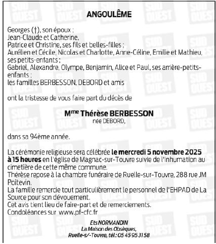 de Madame Thérèse BERBESSON née DEBORD