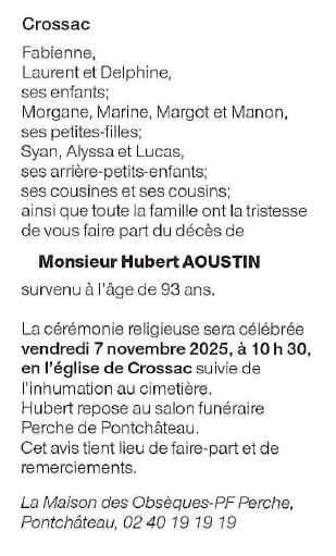 Cet espace « condoléances » est dédié à la mémoire de Monsieur Hubert AOUSTIN.