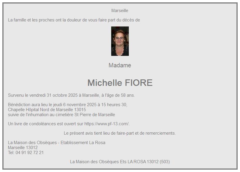 Cet espace « condoléances » est dédié à la mémoire de Madame Michelle FIORE.