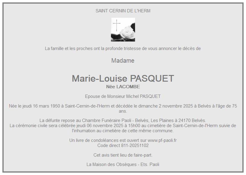 de Madame Marie-Louise PASQUET née LACOMBE