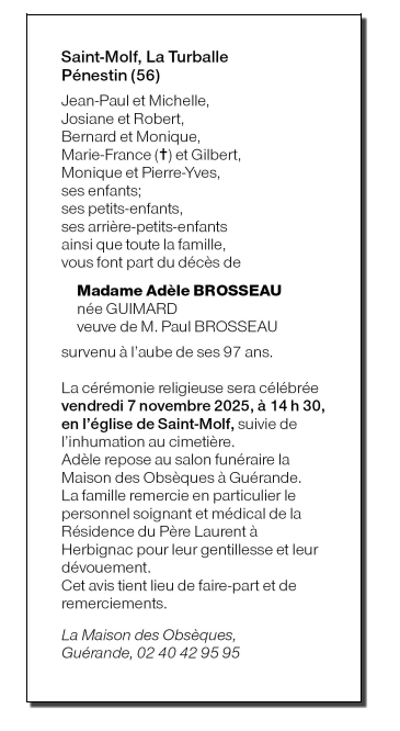 Cet espace « condoléances » est dédié à la mémoire de Madame Adèle BROSSEAU née GUIMARD.
