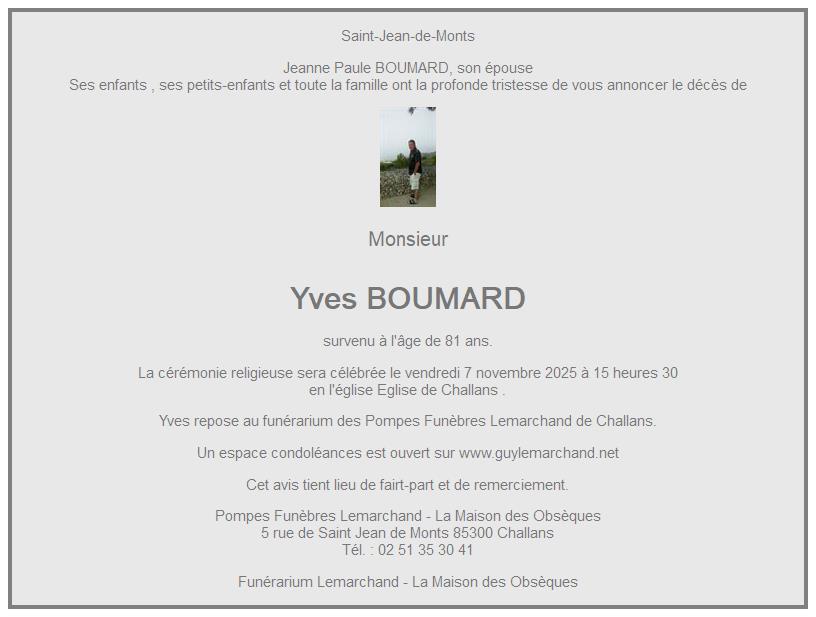 Cet espace « condoléances » est dédié à la mémoire de Monsieur Yves BOUMARD.