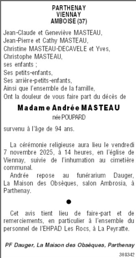 de Madame Andrée MASTEAU née POUPARD