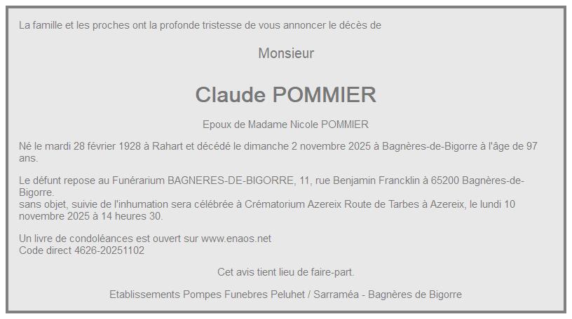 Cet espace « condoléances » est dédié à la mémoire de Monsieur Claude POMMIER.