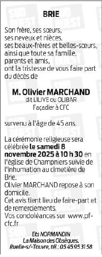 Cet espace « condoléances » est dédié à la mémoire de Monsieur OLIVIER MARCHAND.