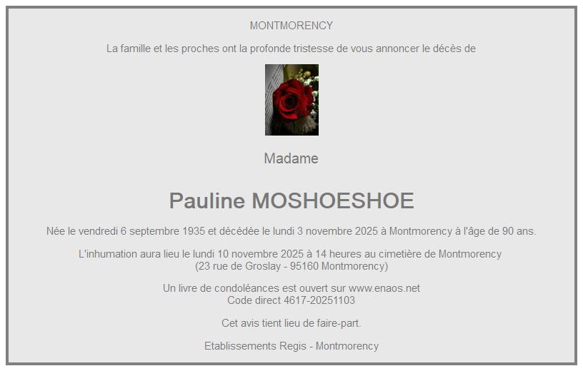 Cet espace « condoléances » est dédié à la mémoire de Madame Pauline MOSHOESHOE.
