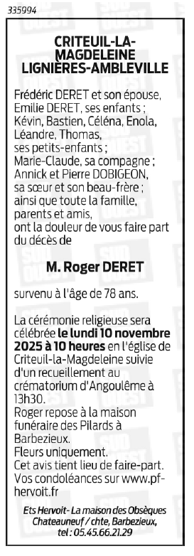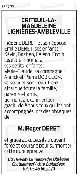 Cet espace « condoléances » est dédié à la mémoire de Monsieur ROGER DERET.