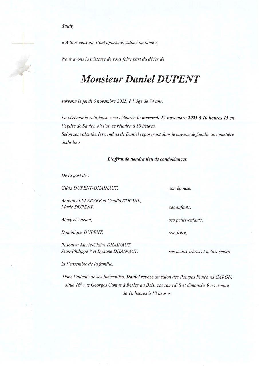Cet espace « condoléances » est dédié à la mémoire de Monsieur Daniel DUPENT.