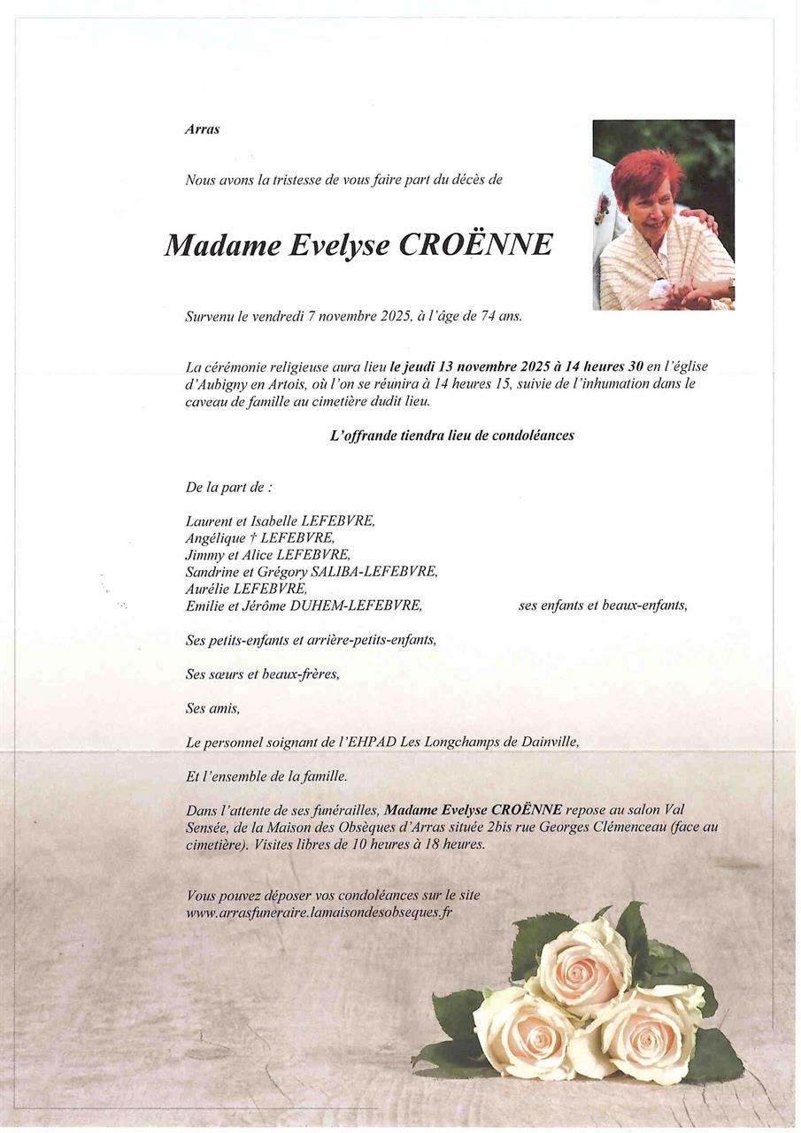 Cet espace « condoléances » est dédié à la mémoire de Madame Evelyse CROËNNE.