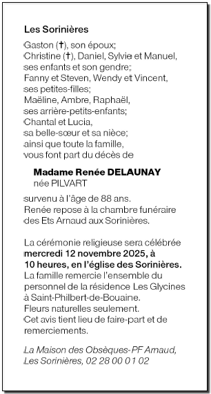 Cet espace « condoléances » est dédié à la mémoire de Madame Renée DELAUNAY née PILVART.