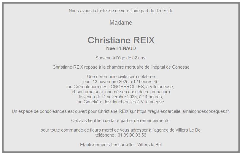 Cet espace « condoléances » est dédié à la mémoire de Madame Christiane REIX née PENAUD.