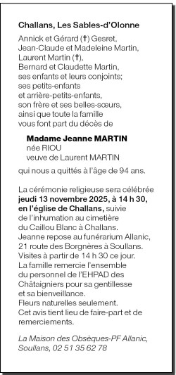 Cet espace « condoléances » est dédié à la mémoire de Madame Jeanne MARTIN née RIOU.