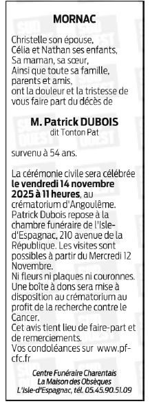 Cet espace « condoléances » est dédié à la mémoire de Monsieur PATRICK DUBOIS.