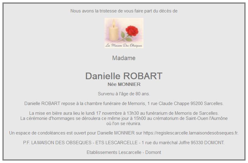 Cet espace « condoléances » est dédié à la mémoire de Madame Danielle ROBART née MONNIER.