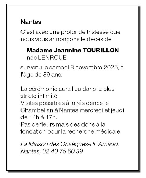 Cet espace « condoléances » est dédié à la mémoire de Madame Jeannine TOURILLON née LENROUÉ.