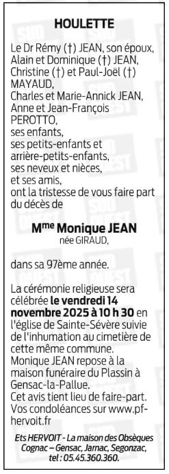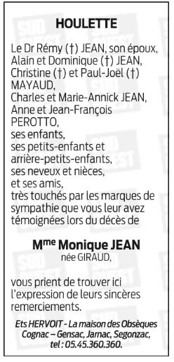 Cet espace « condoléances » est dédié à la mémoire de Madame Marie, Monique JEAN née GIRAUD.
