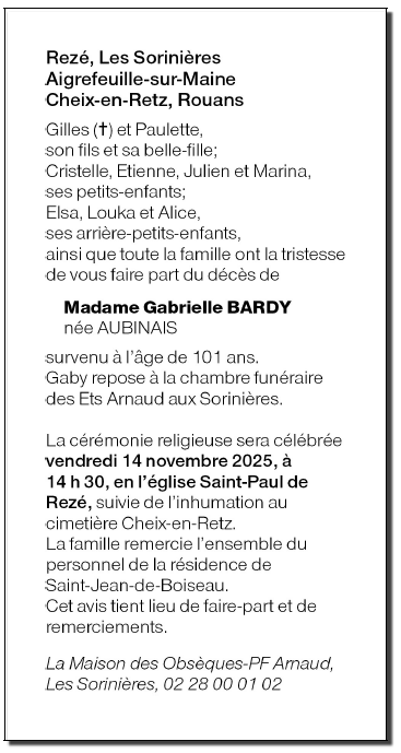 de Madame Gabrielle BARDY née AUBINAIS