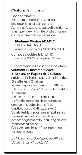 Cet espace « condoléances » est dédié à la mémoire de Madame Marina ABADIE née RABALLAND.