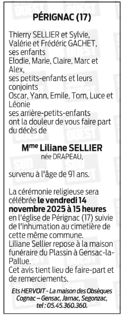 Cet espace « condoléances » est dédié à la mémoire de Madame Lilianne SELLIER née DRAPEAU.