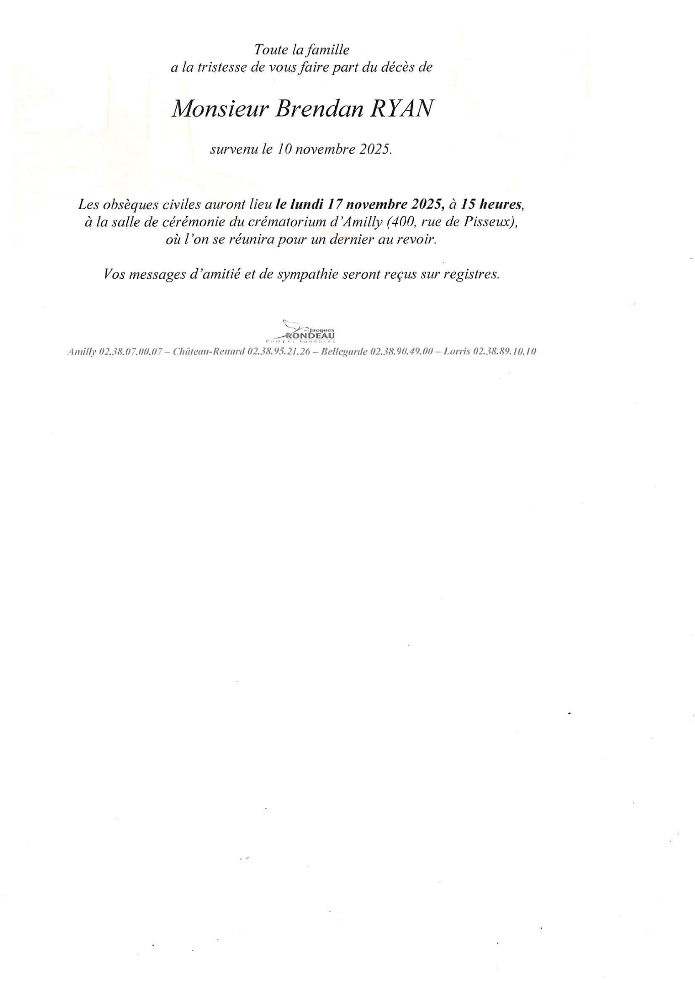 Cet espace « condoléances » est dédié à la mémoire de Monsieur Brendan RYAN.