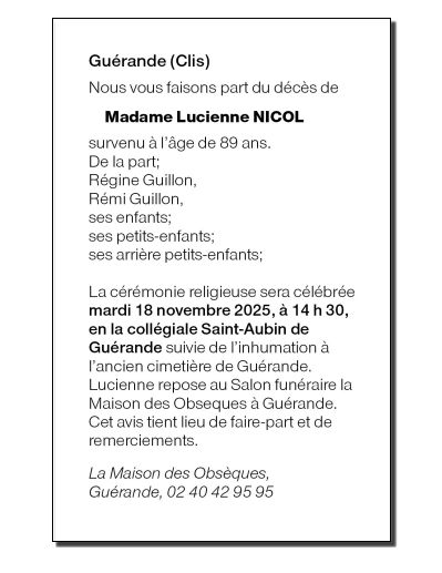 Cet espace « condoléances » est dédié à la mémoire de Madame Lucienne NICOL.