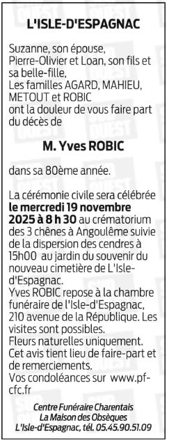 Décédé à L'Isle-d'Espagnac (16340) le mercredi 12 novembre 2025