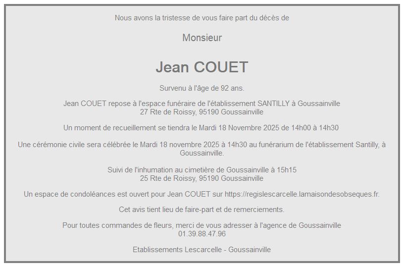 Cet espace « condoléances » est dédié à la mémoire de Monsieur Jean COUET.