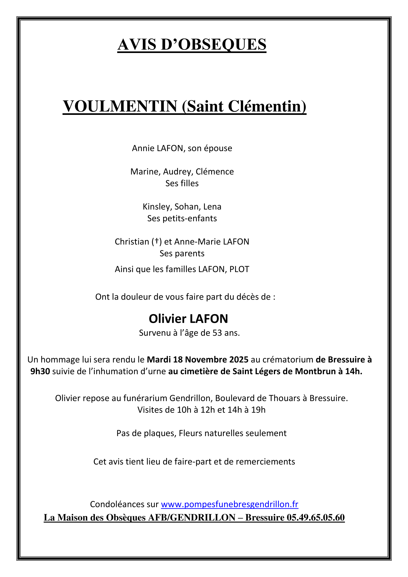 Cet espace « condoléances » est dédié à la mémoire de Monsieur Olivier LAFON.