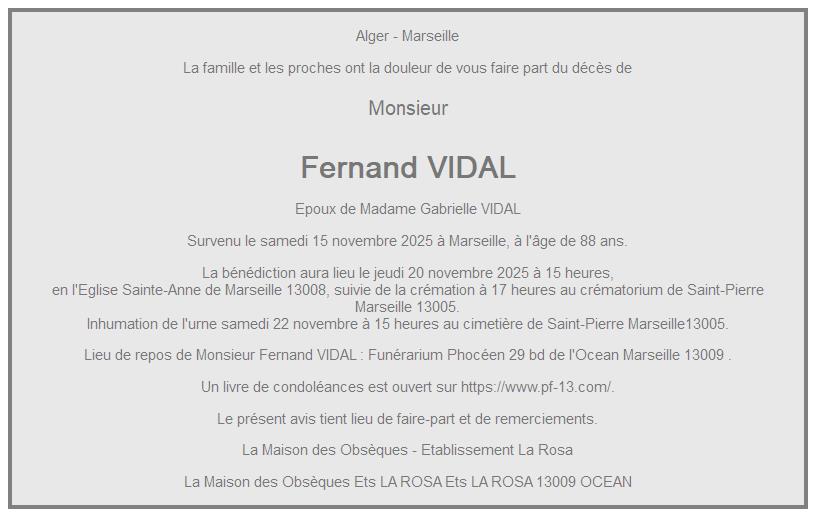Cet espace « condoléances » est dédié à la mémoire de Monsieur Fernand VIDAL.