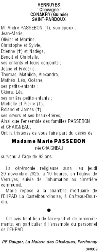 Cet espace « condoléances » est dédié à la mémoire de Madame Marie PASSEBON née CHAIGNEAU.