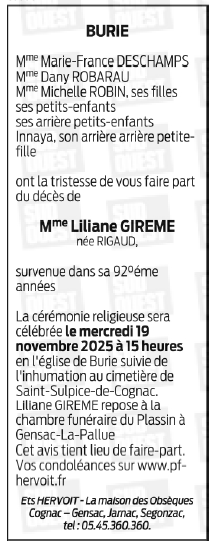 Décédée à Trois-Palis (16730) le samedi 15 novembre 2025